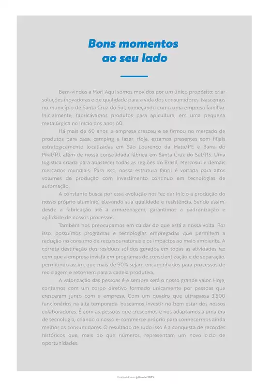 A empresa possuí uma estrutura voltada para altos volumes de produção. Além disso, modernizamos nossos processos de fabricação, não somente implantando novas linhas de produção automatizada, mas dando início a produção do próprio alumínio, elevando sua qualidade e resistência. Dessa maneira, nos tornamos a maior fabricante de cadeiras de praia do Brasil.