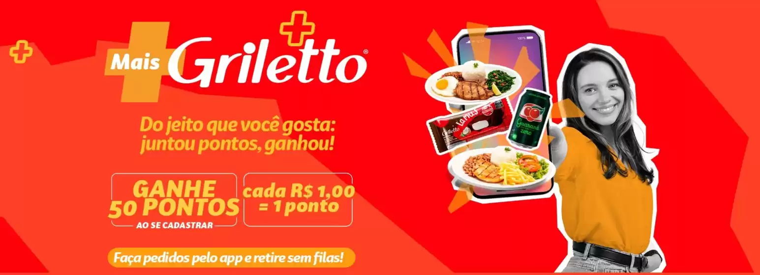 No cardápio do Griletto você encontra muita variedade e combina com tudo aquilo que o brasileiro ama: desde a comida do dia-a-dia, passando pelo tutu de feijão bem temperadinho até o corte suculento da picanha. No Griletto você tem a certeza de sempre encontrar um prato que combina com você. Confira aqui no Tiendeo o restaurante da rede Griletto mais perto de você. Acesse também o site da Griletto para saber mais sobre a marca no http://www.griletto.com.br/.